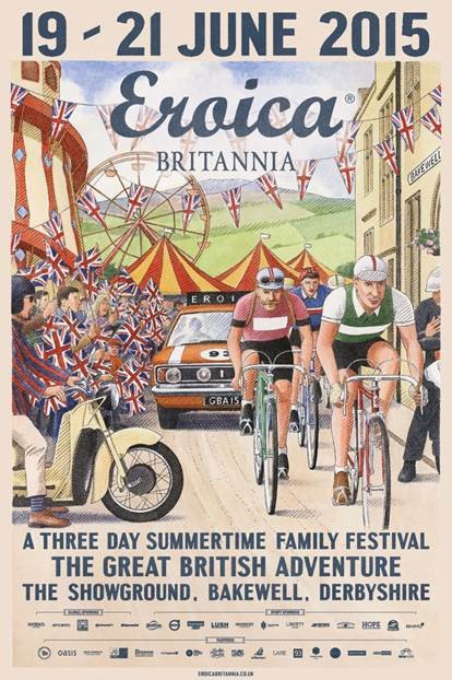 The second year of Eroica Britannia was one of the most talked about events in the cycling and festival calenders for 2015. Over 50,000 wonderful folk travelled from all four corners of the World to make iconic British history in the historic market town of Bakewell, Peak District National Park. What fun we had! 3 sublime sunny festival days of all things handsome. Music, glorious vintage, shopping, food, drink, camping and cycling. I rebuilt the proto type from Raleigh Works of their first ever Triathlon Bike in 1986. Raleigh gave me two bikes , one went to Bernie Shrosbree and the other I kept. It also had the Tri bars that we made for 3T in Italy. Both items are very rare and added to the spirit of the festival. Can be seen at 33 seconds in the video.
